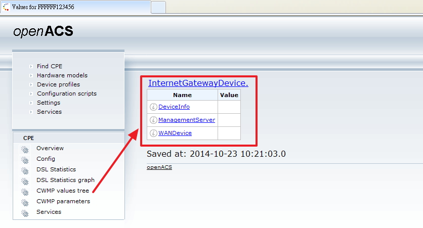 I use OpenACS, and all object of "InternetGatewayDevice." exist in "CWMP values tree" section. see attached file |