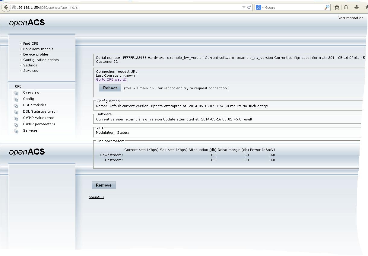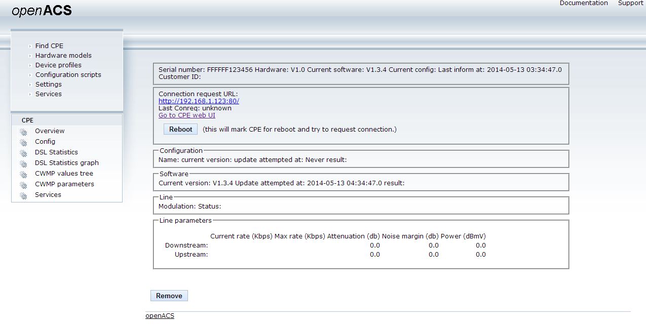 | Description | ACS : openacs-vmware (http://sourceforge.net/projects/openacs/files/openacs-vmware/) cwmp client : EasyCwmp 1.0 on openWRT (http://easycwmp.org/index.php/manual) | ||||