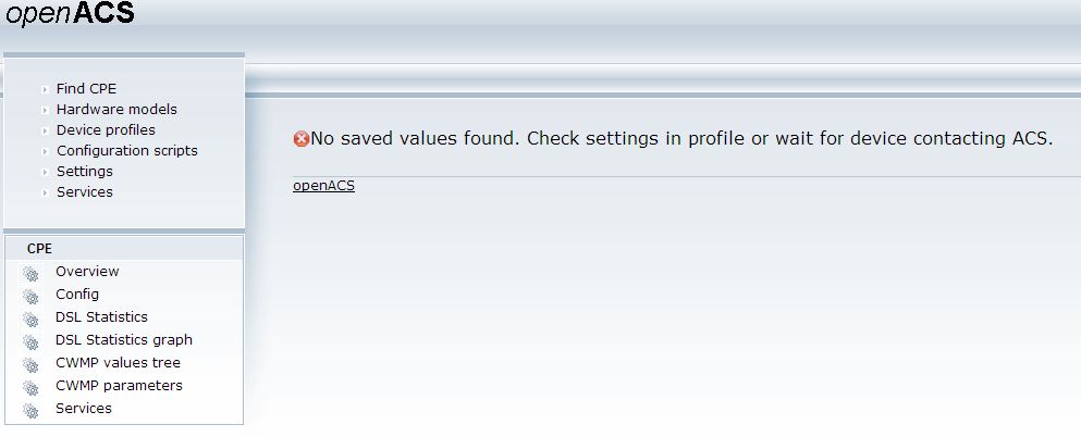| Steps To Reproduce | EasyCwmp can connect openACS, and get some value (sw, hw, sn connectURL) from overview page (http://192.168.1.96:8080/openacs/cpe_overview.jsf). Then, check CWMP tree page (http://192.168.1.96:8080/openacs/cpe_cwmptree.jsf). It will be shown "No saved values found. Check settings in profile or wait for device contacting ACS." If you need some information, please tell me. notes: using fishcorecpe to connect openACS, it is ok to show cwmp tree. thanks, Wind.Shen | ||||