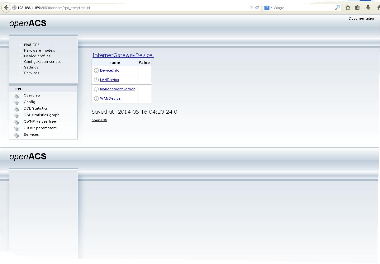 to get the cwmp value tree follow these steps : 1 step ) ==> Run openacs 2 step ) ==> check the config of the CPE (/etc/config/easycwmp)[ACS @ and path]: config local option interface 'eth0' option port '7547' option ubus_socket '/var/run/ubus.sock' option date_format '%FT%T%z' option username 'easycwmp' option password 'easycwmp' config acs option scheme 'http' option port '8080' option path '/openacs/acs' option periodic_enable '1' option hostname '192.168.1.159' option username 'admin' option password 'openacs' option periodic_interval '1800' option parameter_key 'unsetCommandKey' config device option manufacturer 'easycwmp' option oui 'FFFFFF' option product_class 'easycwmp' option serial_number 'FFFFFF123456' option hardware_version 'example_hw_version' option software_version 'example_sw_version' config scripts list location '/lib/functions/network.sh' list location '/usr/share/easycwmp/functions/common' list location '/usr/share/easycwmp/functions/device_info' list location '/usr/share/easycwmp/functions/lan_device' list location '/usr/share/easycwmp/functions/management_server' list location '/usr/share/easycwmp/functions/wan_device' list function 'device_info' list function 'lan_device' list function 'management_server' list function 'wan_device' config notifications 3 step ) ==> * Run the CPE with command : /etc/init.d/easycwmpd start * Check the end of session (204 No Content) 4 step ) ==> Check CWMP value tree I tested with openacs-vmware and it works. see attached picture "cpe_cwmp_tree.JPG" If the problem persists please send us the traffic log (pcap file) |